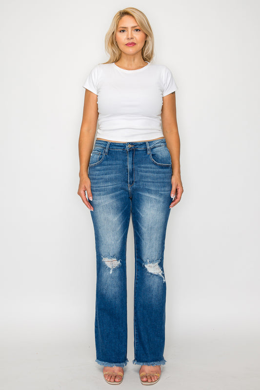 Regular price $69.00 USDRegular priceUnit price / perSale price $69.00 USDThese premium bootcut jeans feature a flattering high-rise fit and fashion distressed details. Made from quality stretch denim in a versatile medium blue wash, they showcase intentional distressing at the knees and fashionable raw hem detailing. The bootcut silhouette creates a balanced proportion while the frayed edges add a contemporary touch. Perfect for casual to semi-casual wear, these jeans combine comfort with style through their premium cotton-blend construction and thoughtful design elements.